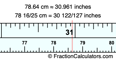 One centimeter is equal to 50/127 inches, and 78.64 as a fraction is 78 16/25. Therefore, to get the fractional answer to 78.64 cm in inches, we multiply 78 16/25 by 50/127 and simplify if necessary.