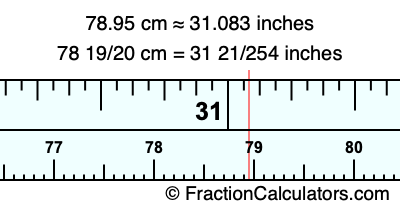 One centimeter is equal to 50/127 inches, and 78.95 as a fraction is 78 19/20. Therefore, to get the fractional answer to 78.95 cm in inches, we multiply 78 19/20 by 50/127 and simplify if necessary.
