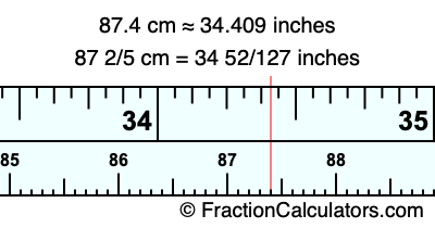 One centimeter is equal to 50/127 inches, and 87.4 as a fraction is 87 2/5. Therefore, to get the fractional answer to 87.4 cm in inches, we multiply 87 2/5 by 50/127 and simplify if necessary.