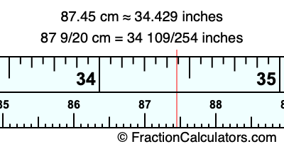 One centimeter is equal to 50/127 inches, and 87.45 as a fraction is 87 9/20. Therefore, to get the fractional answer to 87.45 cm in inches, we multiply 87 9/20 by 50/127 and simplify if necessary.