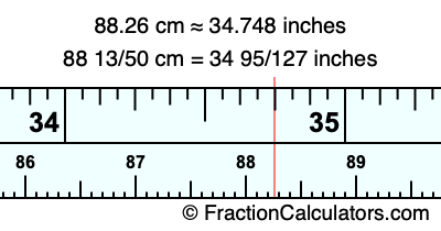 One centimeter is equal to 50/127 inches, and 88.26 as a fraction is 88 13/50. Therefore, to get the fractional answer to 88.26 cm in inches, we multiply 88 13/50 by 50/127 and simplify if necessary.
