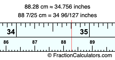 One centimeter is equal to 50/127 inches, and 88.28 as a fraction is 88 7/25. Therefore, to get the fractional answer to 88.28 cm in inches, we multiply 88 7/25 by 50/127 and simplify if necessary.