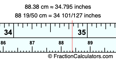 One centimeter is equal to 50/127 inches, and 88.38 as a fraction is 88 19/50. Therefore, to get the fractional answer to 88.38 cm in inches, we multiply 88 19/50 by 50/127 and simplify if necessary.
