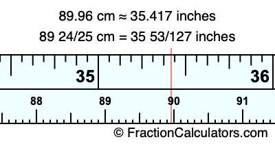 One centimeter is equal to 50/127 inches, and 89.96 as a fraction is 89 24/25. Therefore, to get the fractional answer to 89.96 cm in inches, we multiply 89 24/25 by 50/127 and simplify if necessary.