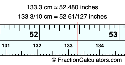 One centimeter is equal to 50/127 inches, and 133.3 as a fraction is 133 3/10. Therefore, to get the fractional answer to 133.3 cm in inches, we multiply 133 3/10 by 50/127 and simplify if necessary.