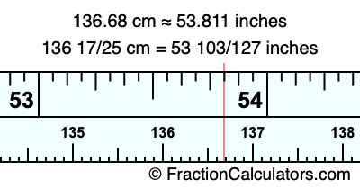 One centimeter is equal to 50/127 inches, and 136.68 as a fraction is 136 17/25. Therefore, to get the fractional answer to 136.68 cm in inches, we multiply 136 17/25 by 50/127 and simplify if necessary.