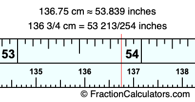 One centimeter is equal to 50/127 inches, and 136.75 as a fraction is 136 3/4. Therefore, to get the fractional answer to 136.75 cm in inches, we multiply 136 3/4 by 50/127 and simplify if necessary.