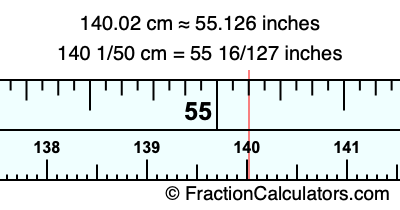 One centimeter is equal to 50/127 inches, and 140.02 as a fraction is 140 1/50. Therefore, to get the fractional answer to 140.02 cm in inches, we multiply 140 1/50 by 50/127 and simplify if necessary.