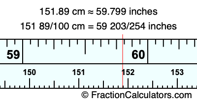 One centimeter is equal to 50/127 inches, and 151.89 as a fraction is 151 89/100. Therefore, to get the fractional answer to 151.89 cm in inches, we multiply 151 89/100 by 50/127 and simplify if necessary.