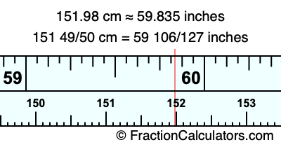 One centimeter is equal to 50/127 inches, and 151.98 as a fraction is 151 49/50. Therefore, to get the fractional answer to 151.98 cm in inches, we multiply 151 49/50 by 50/127 and simplify if necessary.