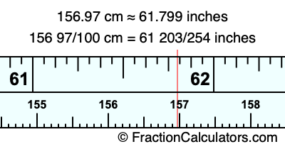 One centimeter is equal to 50/127 inches, and 156.97 as a fraction is 156 97/100. Therefore, to get the fractional answer to 156.97 cm in inches, we multiply 156 97/100 by 50/127 and simplify if necessary.