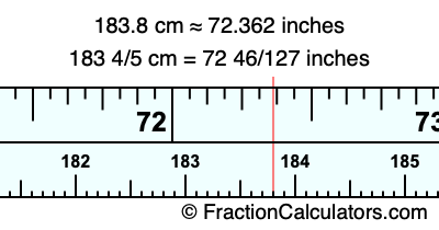 One centimeter is equal to 50/127 inches, and 183.8 as a fraction is 183 4/5. Therefore, to get the fractional answer to 183.8 cm in inches, we multiply 183 4/5 by 50/127 and simplify if necessary.
