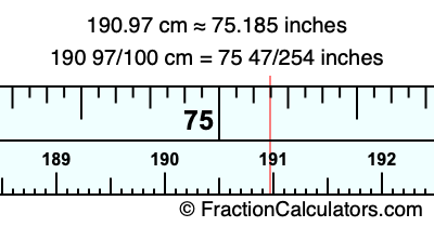 One centimeter is equal to 50/127 inches, and 190.97 as a fraction is 190 97/100. Therefore, to get the fractional answer to 190.97 cm in inches, we multiply 190 97/100 by 50/127 and simplify if necessary.