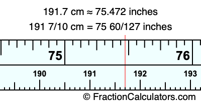 One centimeter is equal to 50/127 inches, and 191.7 as a fraction is 191 7/10. Therefore, to get the fractional answer to 191.7 cm in inches, we multiply 191 7/10 by 50/127 and simplify if necessary.