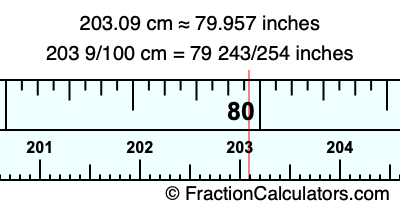 One centimeter is equal to 50/127 inches, and 203.09 as a fraction is 203 9/100. Therefore, to get the fractional answer to 203.09 cm in inches, we multiply 203 9/100 by 50/127 and simplify if necessary.