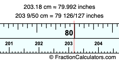 One centimeter is equal to 50/127 inches, and 203.18 as a fraction is 203 9/50. Therefore, to get the fractional answer to 203.18 cm in inches, we multiply 203 9/50 by 50/127 and simplify if necessary.