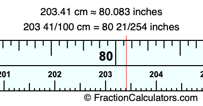 One centimeter is equal to 50/127 inches, and 203.41 as a fraction is 203 41/100. Therefore, to get the fractional answer to 203.41 cm in inches, we multiply 203 41/100 by 50/127 and simplify if necessary.