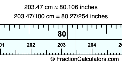 One centimeter is equal to 50/127 inches, and 203.47 as a fraction is 203 47/100. Therefore, to get the fractional answer to 203.47 cm in inches, we multiply 203 47/100 by 50/127 and simplify if necessary.
