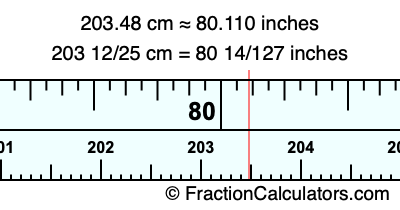 One centimeter is equal to 50/127 inches, and 203.48 as a fraction is 203 12/25. Therefore, to get the fractional answer to 203.48 cm in inches, we multiply 203 12/25 by 50/127 and simplify if necessary.
