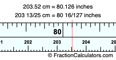 One centimeter is equal to 50/127 inches, and 203.52 as a fraction is 203 13/25. Therefore, to get the fractional answer to 203.52 cm in inches, we multiply 203 13/25 by 50/127 and simplify if necessary.