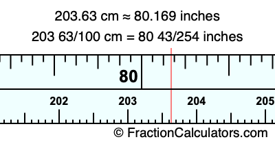 One centimeter is equal to 50/127 inches, and 203.63 as a fraction is 203 63/100. Therefore, to get the fractional answer to 203.63 cm in inches, we multiply 203 63/100 by 50/127 and simplify if necessary.