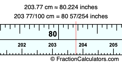 One centimeter is equal to 50/127 inches, and 203.77 as a fraction is 203 77/100. Therefore, to get the fractional answer to 203.77 cm in inches, we multiply 203 77/100 by 50/127 and simplify if necessary.