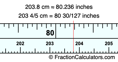One centimeter is equal to 50/127 inches, and 203.8 as a fraction is 203 4/5. Therefore, to get the fractional answer to 203.8 cm in inches, we multiply 203 4/5 by 50/127 and simplify if necessary.