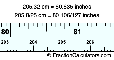 One centimeter is equal to 50/127 inches, and 205.32 as a fraction is 205 8/25. Therefore, to get the fractional answer to 205.32 cm in inches, we multiply 205 8/25 by 50/127 and simplify if necessary.