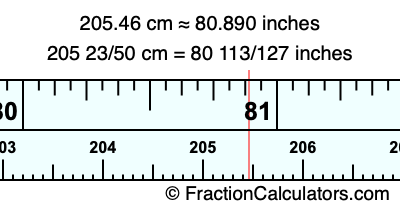 One centimeter is equal to 50/127 inches, and 205.46 as a fraction is 205 23/50. Therefore, to get the fractional answer to 205.46 cm in inches, we multiply 205 23/50 by 50/127 and simplify if necessary.