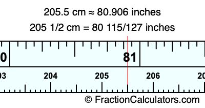 One centimeter is equal to 50/127 inches, and 205.5 as a fraction is 205 1/2. Therefore, to get the fractional answer to 205.5 cm in inches, we multiply 205 1/2 by 50/127 and simplify if necessary.