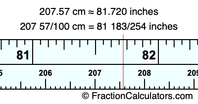 One centimeter is equal to 50/127 inches, and 207.57 as a fraction is 207 57/100. Therefore, to get the fractional answer to 207.57 cm in inches, we multiply 207 57/100 by 50/127 and simplify if necessary.