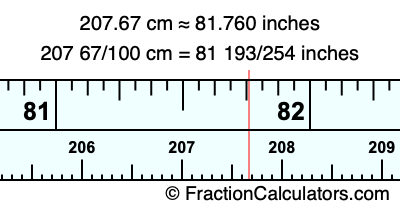 One centimeter is equal to 50/127 inches, and 207.67 as a fraction is 207 67/100. Therefore, to get the fractional answer to 207.67 cm in inches, we multiply 207 67/100 by 50/127 and simplify if necessary.