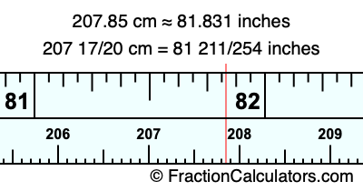 One centimeter is equal to 50/127 inches, and 207.85 as a fraction is 207 17/20. Therefore, to get the fractional answer to 207.85 cm in inches, we multiply 207 17/20 by 50/127 and simplify if necessary.