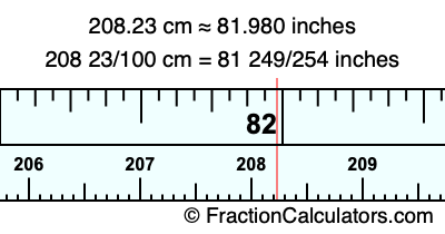 One centimeter is equal to 50/127 inches, and 208.23 as a fraction is 208 23/100. Therefore, to get the fractional answer to 208.23 cm in inches, we multiply 208 23/100 by 50/127 and simplify if necessary.