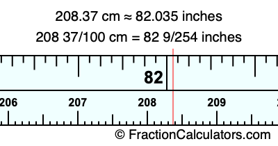 One centimeter is equal to 50/127 inches, and 208.37 as a fraction is 208 37/100. Therefore, to get the fractional answer to 208.37 cm in inches, we multiply 208 37/100 by 50/127 and simplify if necessary.
