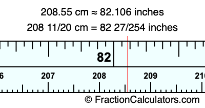 One centimeter is equal to 50/127 inches, and 208.55 as a fraction is 208 11/20. Therefore, to get the fractional answer to 208.55 cm in inches, we multiply 208 11/20 by 50/127 and simplify if necessary.