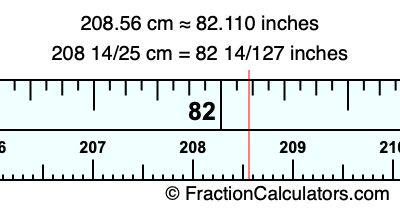 One centimeter is equal to 50/127 inches, and 208.56 as a fraction is 208 14/25. Therefore, to get the fractional answer to 208.56 cm in inches, we multiply 208 14/25 by 50/127 and simplify if necessary.