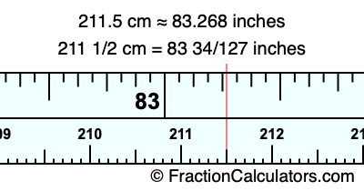 One centimeter is equal to 50/127 inches, and 211.5 as a fraction is 211 1/2. Therefore, to get the fractional answer to 211.5 cm in inches, we multiply 211 1/2 by 50/127 and simplify if necessary.