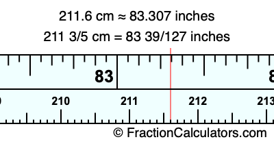 One centimeter is equal to 50/127 inches, and 211.6 as a fraction is 211 3/5. Therefore, to get the fractional answer to 211.6 cm in inches, we multiply 211 3/5 by 50/127 and simplify if necessary.