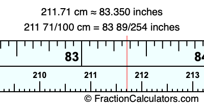 One centimeter is equal to 50/127 inches, and 211.71 as a fraction is 211 71/100. Therefore, to get the fractional answer to 211.71 cm in inches, we multiply 211 71/100 by 50/127 and simplify if necessary.