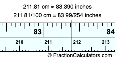 One centimeter is equal to 50/127 inches, and 211.81 as a fraction is 211 81/100. Therefore, to get the fractional answer to 211.81 cm in inches, we multiply 211 81/100 by 50/127 and simplify if necessary.