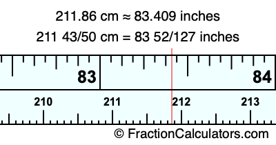 One centimeter is equal to 50/127 inches, and 211.86 as a fraction is 211 43/50. Therefore, to get the fractional answer to 211.86 cm in inches, we multiply 211 43/50 by 50/127 and simplify if necessary.