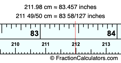 One centimeter is equal to 50/127 inches, and 211.98 as a fraction is 211 49/50. Therefore, to get the fractional answer to 211.98 cm in inches, we multiply 211 49/50 by 50/127 and simplify if necessary.