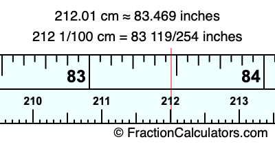 One centimeter is equal to 50/127 inches, and 212.01 as a fraction is 212 1/100. Therefore, to get the fractional answer to 212.01 cm in inches, we multiply 212 1/100 by 50/127 and simplify if necessary.
