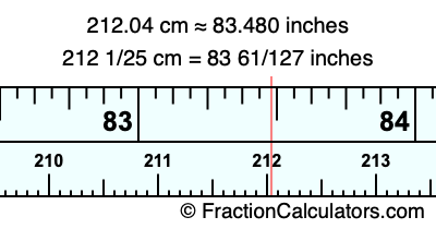 One centimeter is equal to 50/127 inches, and 212.04 as a fraction is 212 1/25. Therefore, to get the fractional answer to 212.04 cm in inches, we multiply 212 1/25 by 50/127 and simplify if necessary.