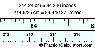 One centimeter is equal to 50/127 inches, and 214.24 as a fraction is 214 6/25. Therefore, to get the fractional answer to 214.24 cm in inches, we multiply 214 6/25 by 50/127 and simplify if necessary.