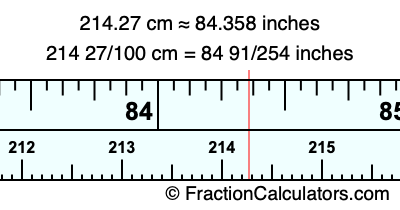 One centimeter is equal to 50/127 inches, and 214.27 as a fraction is 214 27/100. Therefore, to get the fractional answer to 214.27 cm in inches, we multiply 214 27/100 by 50/127 and simplify if necessary.