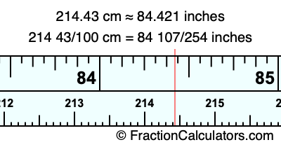 One centimeter is equal to 50/127 inches, and 214.43 as a fraction is 214 43/100. Therefore, to get the fractional answer to 214.43 cm in inches, we multiply 214 43/100 by 50/127 and simplify if necessary.