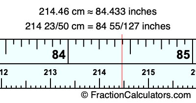 One centimeter is equal to 50/127 inches, and 214.46 as a fraction is 214 23/50. Therefore, to get the fractional answer to 214.46 cm in inches, we multiply 214 23/50 by 50/127 and simplify if necessary.