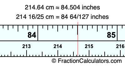 One centimeter is equal to 50/127 inches, and 214.64 as a fraction is 214 16/25. Therefore, to get the fractional answer to 214.64 cm in inches, we multiply 214 16/25 by 50/127 and simplify if necessary.
